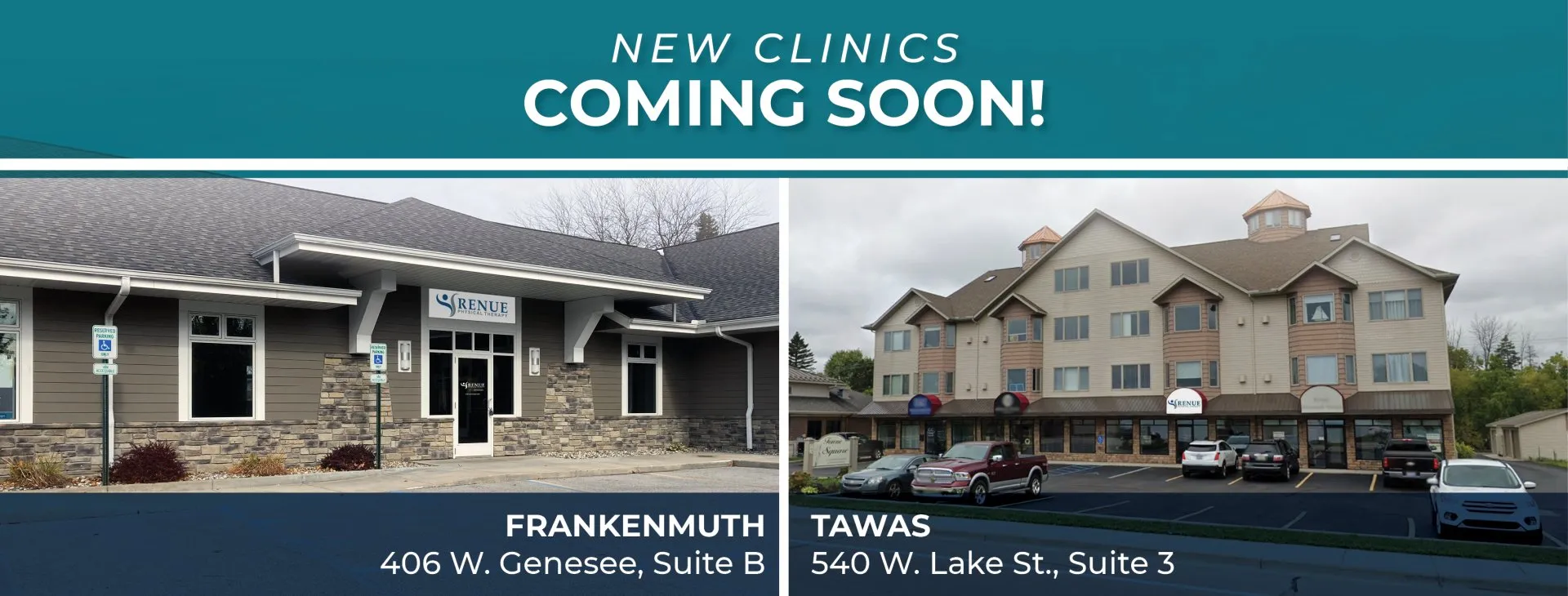 Renue Physical Therapy in January will open new outpatient physical therapy clinics in Frankenmuth and Tawas. With the opening of these clinics, Renue now serves Mid-Michigan with 16 outpatient physical therapy clinics.